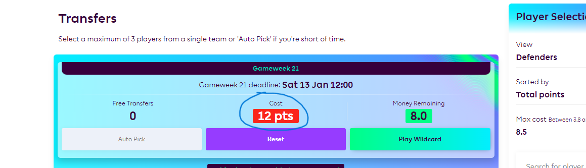 ⚠️ VAŽNO: Ukoliko u jednom kolu iskoristite sve free transfere i napravite još neki dodatni transfer, bićete kažnjeni sa -4 poena za svaki dodatni transfer koji ste napravili i ovo je jako bitna stavka za sve početnike u fantaziju. (Primer sa gornje slike: za 3 dodatna transfera bićete kažnjeni sa čak -12 poena, odnosno za svaki transfer -4, što je ukupno -12)